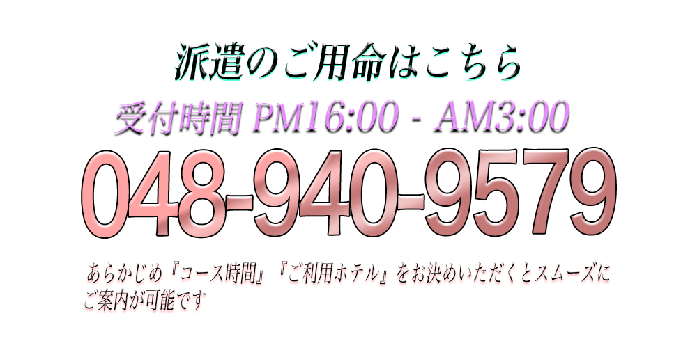 2026/01/15皆様のご予約、お待ちしております♪( ´▽`)【出勤予定】♡完全未経験♡サブカル系セラピスト❤︎月野うさぎ(23)T.158B.84(E)W.55H.83★17:00~ご案内可能★派遣可能場所ホテル◯自宅派遣×♡グラマラスBODYの人気セラピスト❤︎宮田 すず(27)T.160B.90(F)W.57H.82★18:00~ご案内可能★派遣可能場所ホテル◯自宅派遣×♡キレ可愛いグラマラス❤︎三上 ゆり(24)T.153B.87(E)W.57H.86★19:00~ご案内可能★派遣可能場所ホテル◯自宅派遣×初めてご利用のお客様へおすすめの超割引を進呈いたします!通常DokiDokiコース 70min 15,000円→こちらのコースを初めてご利用の方に限り割引後 70min 10,000円(※5,000円割引)で、ご案内します!ご指名料も無料でのご案内となっておりますのでこの機会にぜひ、お試しくださいませ!!【全コース対象限定割引】◽️70分コースを事前にご予約いただくと総額より1,000円割引通常★DokiDokiコース70分 15,000円 → 14,000円仰向け★超DokiDokiコース70分 20,000円 → 19,000円◽️100分コースを事前にご予約いただくと総額より2,000円割引でご案内致します!通常★DokiDokiコース100分 20,000円 → 18,000円仰向け★超DokiDokiコース100分 25,000円 → 23,000円※ご予約の際に限定割引を使いたい!とお伝えください※他の割引との併用はできません【ご予約受付中】お電話 048-940-9579